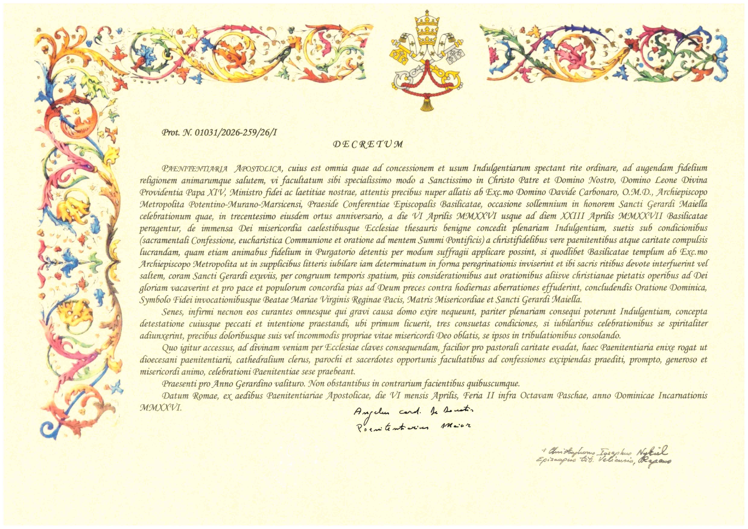 La Penitenzieria Apostolica, a cui compete ordinare correttamente ciò che riguarda la concessione e l’uso delle indulgenze, al fine di accrescere la pietà dei fedeli e la salvezza delle anime, in forza delle facoltà ad essa concesse in modo del tutto speciale dal Santissimo in Cristo Padre e Signore Nostro per Divina Provvidenza Papa Leone XIV, Ministro della fede e della nostra gioia, assecondando le preghiere a noi rivolte in tale materia da parte dell’Eccellentissimo Monsignore Davide Carbonaro, dell’Ordine dei Chierici della Madre di Dio, Arcivescovo Metropolita di Potenza-Muro Lucano-Marsico Nuovo e Presidente della Conferenza Episcopale di Basilicata, in occasione delle solenni celebrazioni in onore di San Gerardo Maiella, nel trecentesimo anniversario della sua nascita, dall’immensa misericordia di Dio e dai celesti tesori della Chiesa benignamente concede alla regione Basilicatal’indulgenza plenaria da lucrarsi dal giorno 6 aprile 2026 al giorno 23 aprile 2027 alle consuete condizioni (confessione sacramentale, comunione eucaristica e preghiera secondo le intenzioni del Sommo Potefice) da parte dei fedeli cristiani veramente pentiti e spinti dalla carità.